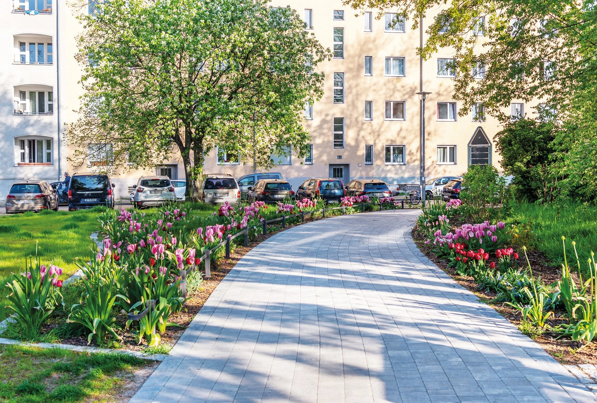 Der ‚Stadtgarten‘, mit einer Komposition aus ganzjährig blühenden Stauden, Gräsern und Gehölzpflanzungen, schafft einen besonderen Rückzugs- und Aufenthaltsort. Eine Baumrundbank und einzelne Gartenbänke unterstreichen den besonderen Charakter dieses Grünraumes und lassen diesen auf eine andere Art erlebbar machen.