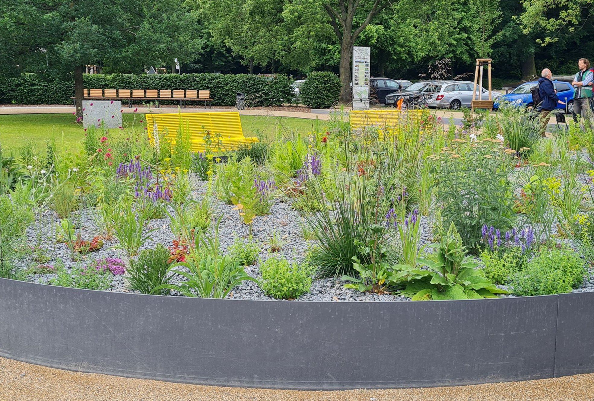 Die vorgefundenen Strukturen wurden in die neue großzügige Anlage integriert. Die Symmetrie der neuen Gestaltung findet sich in von Wegeflächen umgebenen Rasenflächen und einem zentralen Hochbeet mit Staudenpflanzung wieder. Verschiedene Sitzmöbel laden zum Verweilen ein. Am Entrée begrüßen zwei Stelen mit Porträts der beiden Gartengestalter den Besucher (gestaltet von Susanne Ahner), in der Fläche informieren zwei Tafeln über Lenné und Meyer und führen auf einem Rundweg durch den Friedrichshain.